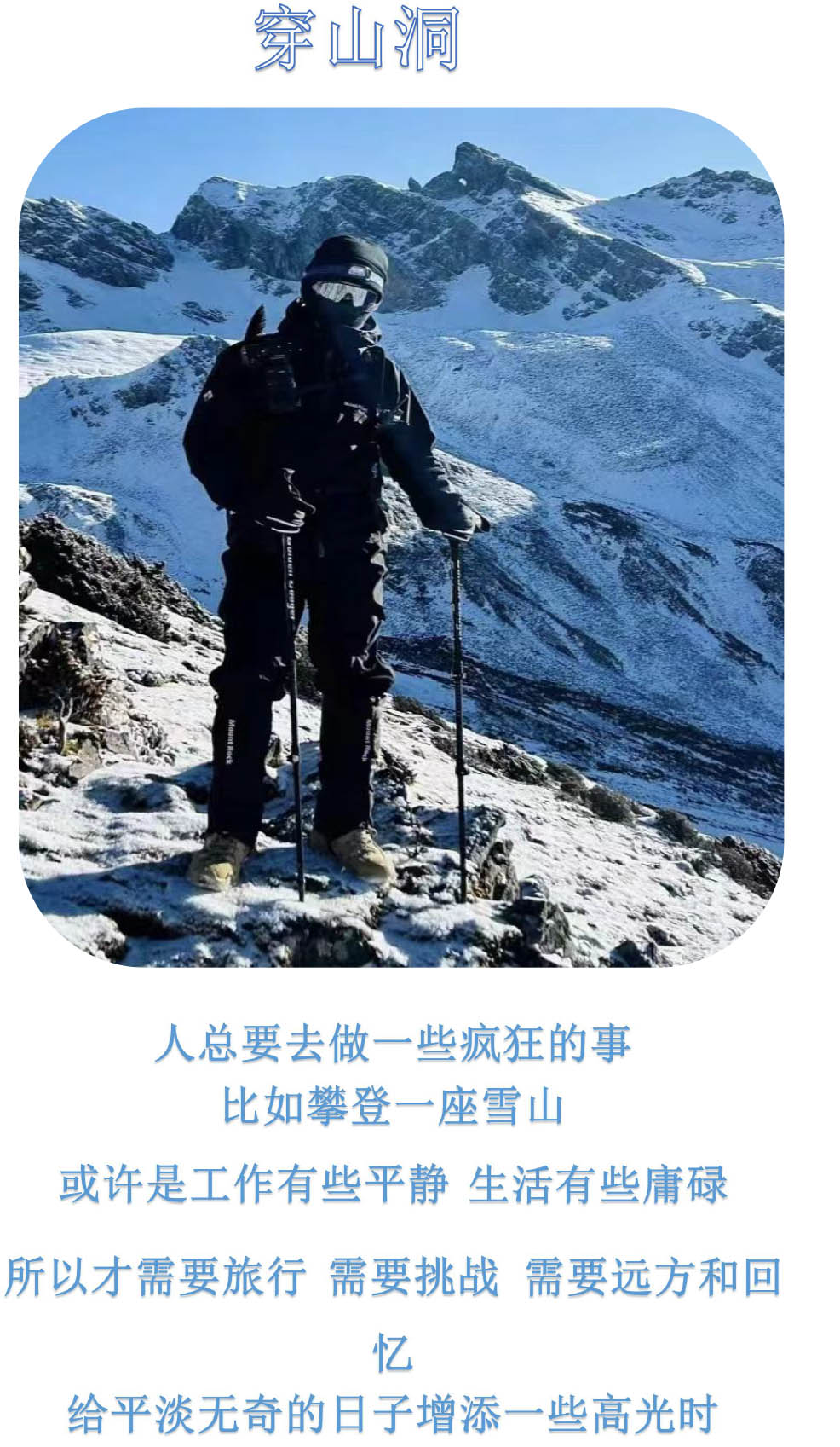 人总要去做一些疯狂的事,比如攀登一座雪山或许是工作有些平静,生活有些庸碌,所以才需要旅行、需要挑战、需要远方和回忆给平淡无奇的日子增添一些高光时。